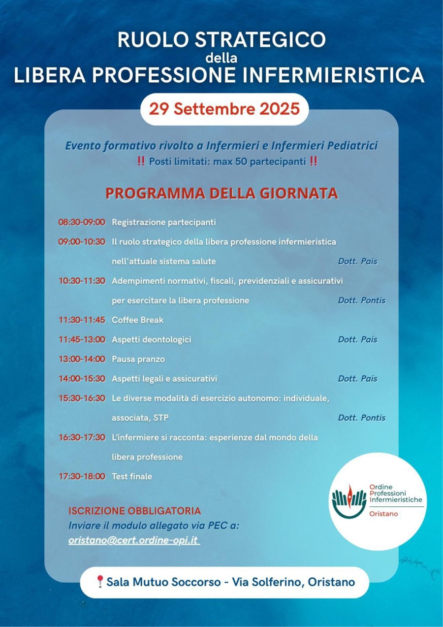 L'OPI di Oristano ha organizzato un Evento formativo rivolto a Infermieri e Infermieri Pediatrici, che si terrà ad Oristano in data 29/09/2025, per max 50 partecipanti. Nei Dettagli si pubblicano il modulo di iscrizione e il programma della giornata.