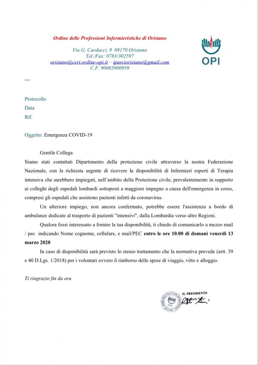 Richiesta infermieri volontari a supporto delle zone sottoposte a maggior impegno a causa dell'emergenza COVID19.